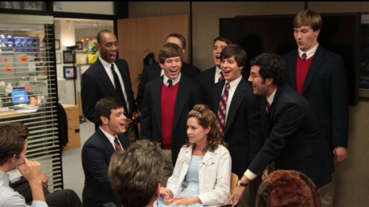 O quinto episódio da última temporada do seriado recebeu nota 7 dos usuários do IMDb. Em “Here Comes The Treble”, Andy leva para o escritório o antigo grupo de acapella dele, o Cornell, mas os colegas de trabalhos ficam pouco impressionados com a aparição especial. (Foto: Reprodução / NBC Universal Media)