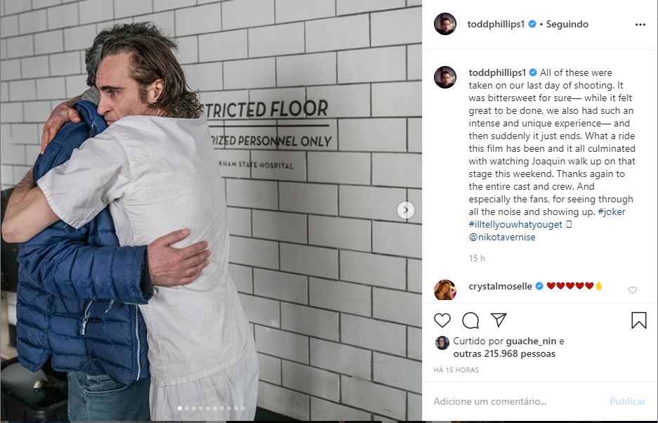 Em tradução livre: “Todas essas fotos foram tiradas no nosso último dia de gravações. Foi com certeza um sentimento agridoce, enquanto foi ótimo estar encerrando, também tivemos uma experiência intensa e única, que de repente ela acabou. Que aventura esse filme vem sendo e tudo se resumiu em ver Joaquin subir ao palco nesse final de semana (Oscar).”