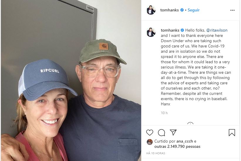 “Eu e a Rita estamos aqui para agradecer todos daqui debaixo (Austrália), que estão cuidando tão bem da gente”, disse Hanks na publicação. Veja a foto clicando aqui ou abaixo: