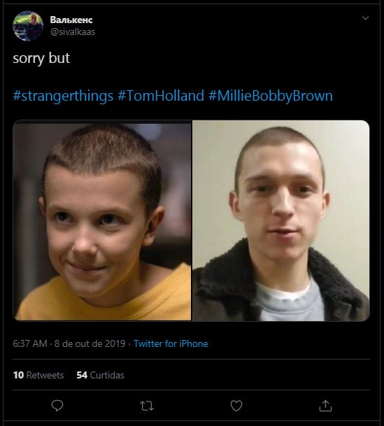 Tradução: “Desculpa mas #strangerthings #TomHolland #MillieBobbyBrown