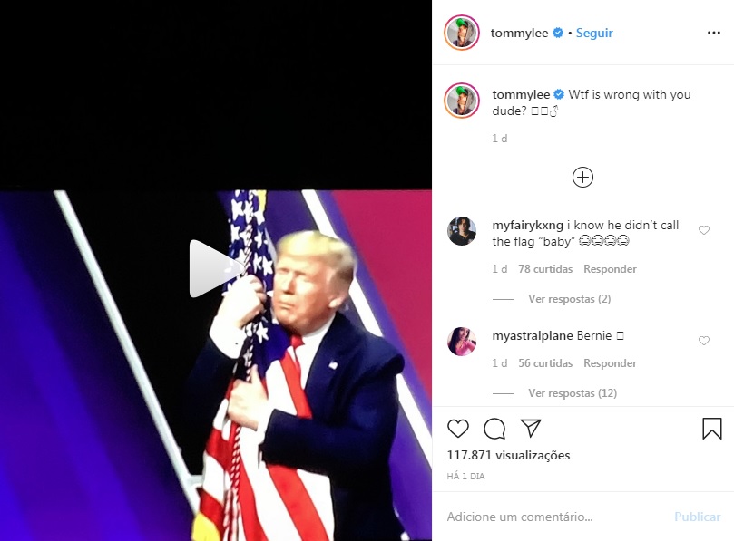 Em um evento recente de partidos conservadores, ele abraçou e beijou uma bandeira dos Estados Unidos de um jeito bem estranho. A cena bizarra deixou Tommy Lee, baterista do Motley Crue, sem entender “o que há de errado” com o presidente.