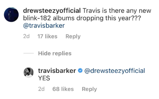 De acordo com Travis Barker, o Blink-182 está trabalhando para lançar novidades em 2021. O baterista respondeu o comentário de um fã no Instagram, que perguntava se novos discos da banda seriam lançados em 2021. Barker respondeu que sim.