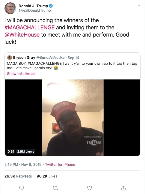 “GAROTO DO MAGA [Make America Great Again, slogan de Trump]. #MAGACHALLENGE Eu quero que todos vocês façam seu próprio rap com essa batida e me marquem! Vamos fazer os liberais chorarem!”, escreveu Gray no Twitter.