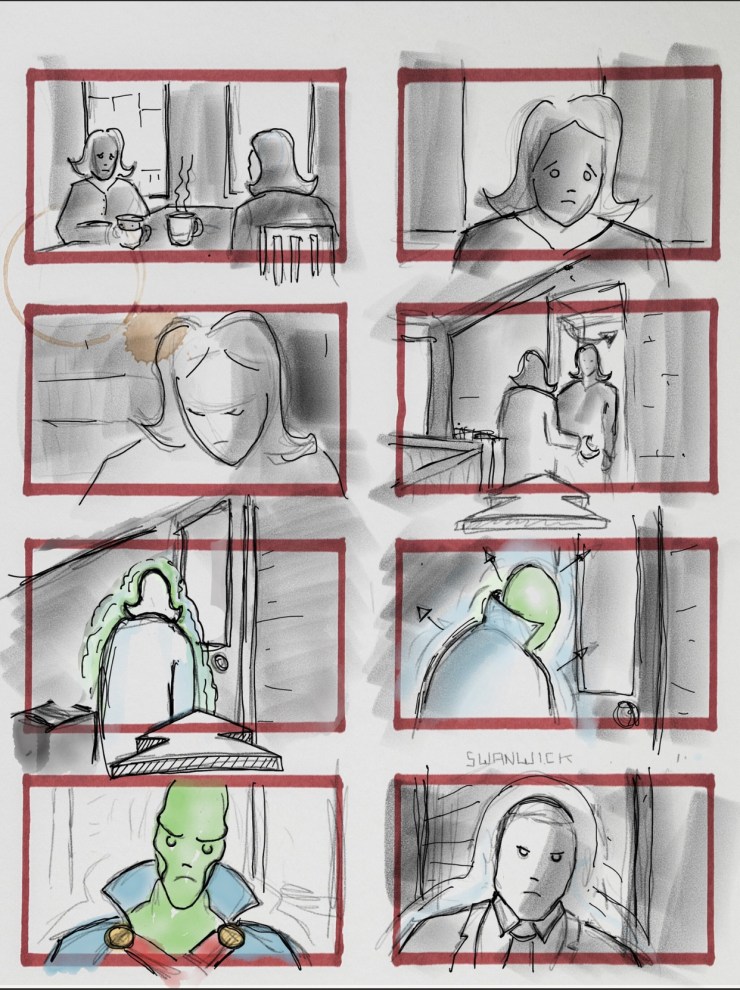 Snyder até revelou o storyboard de quando ele apareceria – e podemos ter um pequeno vislumbre da cena no trailer divulgado durante DC FanDome.