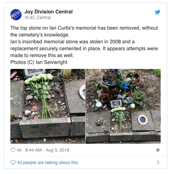 Nas imagens, é possível ver que uma das pedras que cobre o local em que o corpo de Curtis foi enterrado foi retirada. Ela ficava acima da peça em que o nome do músico está gravado, junto com sua data de nascimento e morte e a frase “Love Will Tear Us Apart”, título de uma das mais icônicas músicas do Joy Division