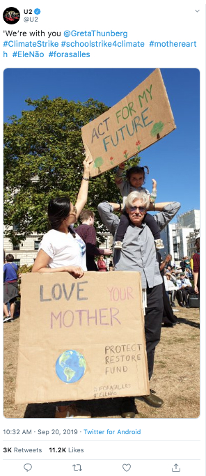 Além disso, usaram a hashtag ForaSalles. Ricardo Salles é o atual ministro do Meio Ambiente e tem sido muito criticado após os incêndios na Amazônia. Inclusive, a foto da publicação mostra o baixista do U2, Adam Clayton, ao lado da esposa brasileira Mariana de Carvalho e da filha em uma manifestação global contra mudanças climáticas.
