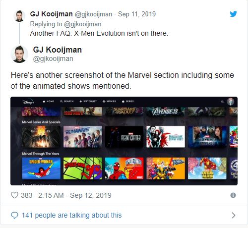 A Disney ainda não confirmou se os títulos serão exclusivos ao país ou disponíveis para diversas regiões. Dentre os desenhos disponíveis estão X-Men (de 1992) Mulher-Aranha (1979), Homem-Aranha (1981), Homem-Aranha e seus amigos (1981), Homem de Ferro (1994), O  Incrível Hulk (1996), O Surfista Prateado (1998) e Homem-Aranha: Ação Sem Limites (1999).