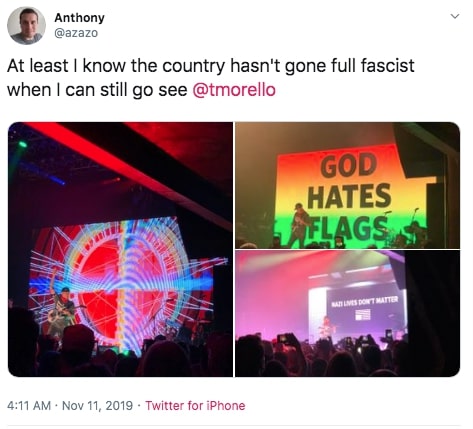 Um fã publicou no Twitter imagens do show de Morello e nelas é possível ver as mensagens que o músico tem exibido no telão. Em uma foto está escrito “Nazi lives don’t matter” (em tradução livre, “As vidas dos nazistas não importam”), em paródia a “Black lives matter” (em tradução livre, “As vidas negras importam”).