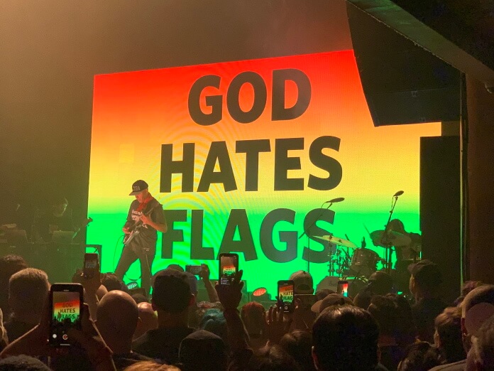 Além desta, o guitarrista também escolheu para o telão a frase: “God hates flags” (em tradução livre, “Deus odeia bandeiras”), e fez uma paródia com “God hates fags” (em tradução livre, “Deus odeia bichas”), frase utilizada por religiosos conservadores contra a comunidade LGBTQ+.