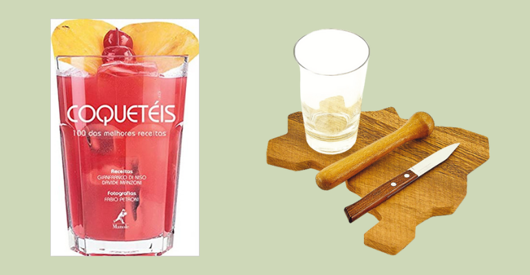 Kit para caipirinha, livro com receitas de coquetéis e outros itens que vão facilitar o seu happy-hour